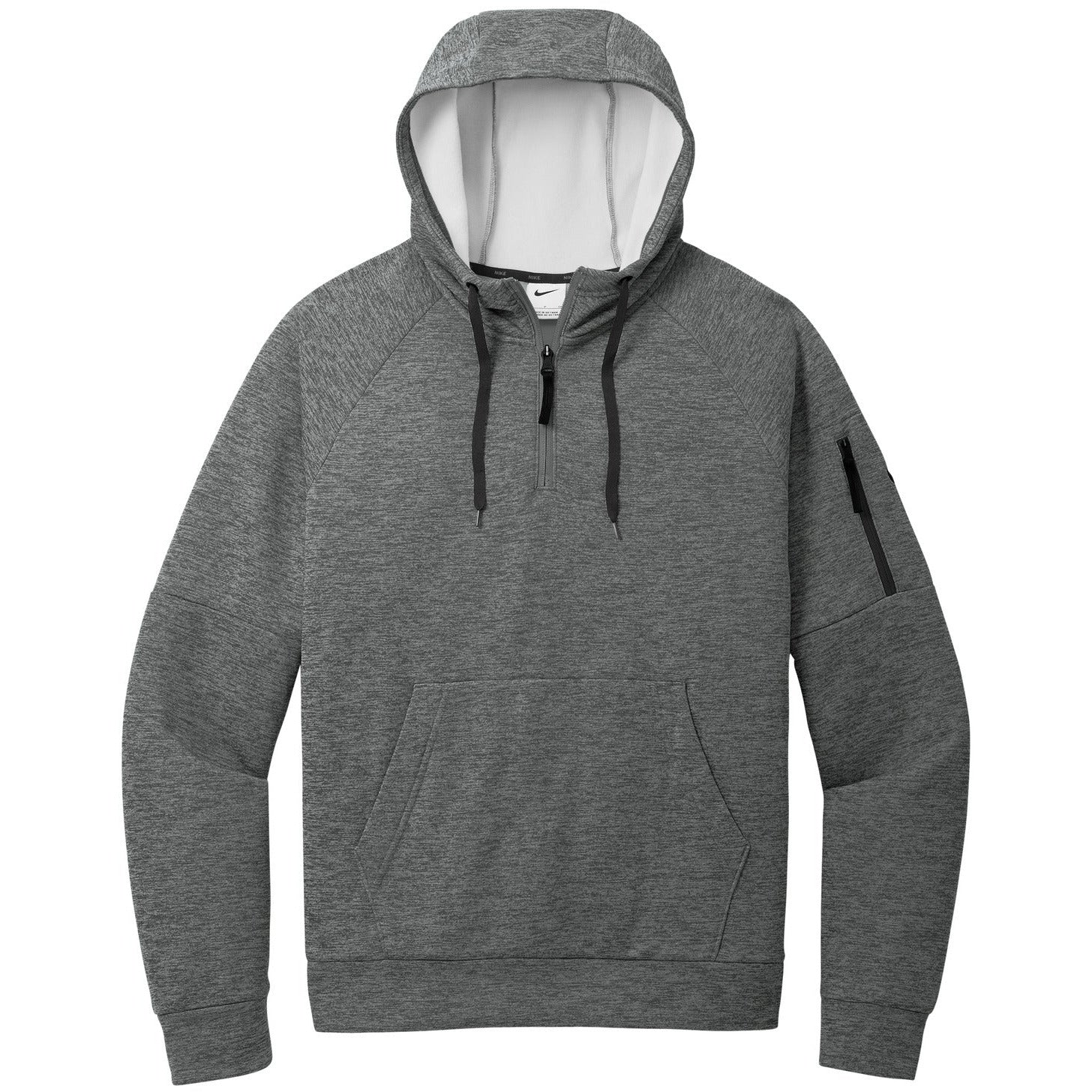 This 1/4-zip hoodie with a zippered left arm pocket brings the heat to your workout with Therma-FIT fabric. Therma-FIT helps manage your body's natural heat to keep warm in cold-weather conditions. The design includes a three-panel hood with black drawcords, a dyed-to-match zipper and a front pouch pocket. Self-fabric cuffs and hem. A contrast Swoosh logo is embroidered on left sleeve. A contrast Therma-FIT logo is embroidered on back hem. Made of 7.4-ounce polyester Therma-FIT fabric with at least 50% recycled content.