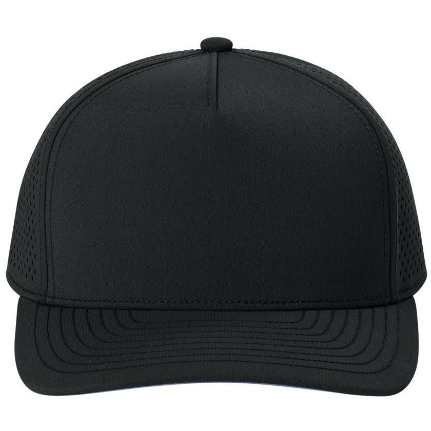 This cap combines performance features with the look of a traditional trucker. 94/6 polyester/spandex micro ripstop 100% polyester brushed twill underbill Gusty grey underbill Durable water repellent (DWR) finish helps keep cap afloat in water 5-panel with curved bill Moisture-wicking sweatband and front panel lining Breathable oval pattern perforation in mid and back panels Structured Low-profile 7-position adjustable snapback closure Matte black silicone O icon at left of keyhole