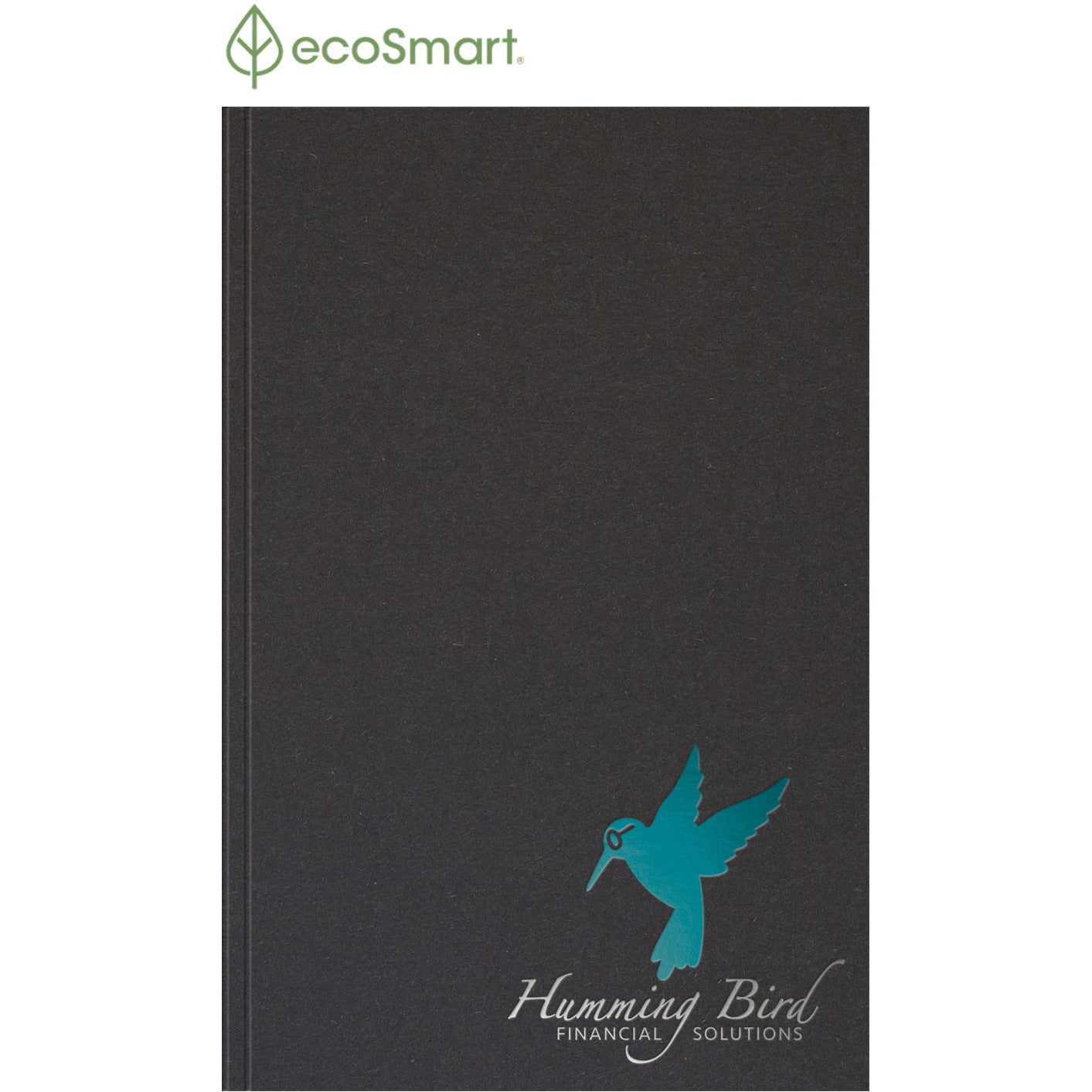 Flexible, wraparound 100% recycled paper covers. Includes 1-color foil or blind deboss imprint. 100 sheets of 60# lined EcoFiller, or blank. Graph or dot grid available for an upcharge (contact sales for pricing). Perfect-bound spine. 5.5" x 8.5"