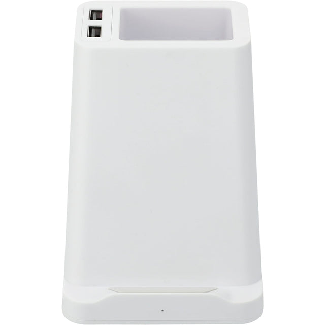 The Wireless Charging Pen Holder with Dual Outputs is a perfect desktop organizer that allows to charge your smartphone vertically without the cables and charge other devices with two USB output ports at the same time. Supports wireless charging at up to 5W for devices including (but not limited to ): iPhone 8/8Plus/X/XS/XS Max/XR/11/11 Pro/11 Pro Max/12/12 Pro/12 Pro Max/12 mini/13/13 Pro/13 Pro Max/13 Mini * Samsung Galaxy Note5/S6/S6 Edge/S6 Edge+/S7/S7 Edge/S8/S8+/S9/S9+/Note9 * Google Nexus 5/6/7 * HTC Droid DNA 8X * LG G3/G4, Lucid 2/3 * Nokia Lumia 920/930 *. To charge an iPhone series before iPhone 8 with wireless technology, an external wireless charging receiver or receiver case is required. Works with most plastic phone cases on. Dual outputs: 5V/1.5A max. Includes 39" 3A USB-A-to-Type-C charging cable.