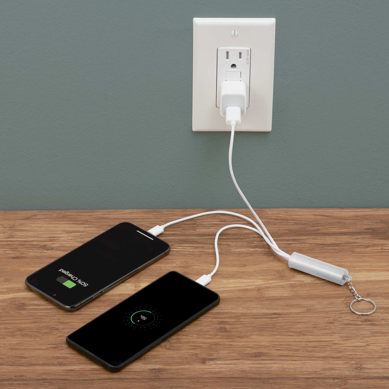 The Route Light Up 5-in-1 Charging Cable is a versatile and portable charging solution, designed to keep your devices powered wherever you go. It features a USB-A input adapter, a Type-C input tip, and multiple output tips, including a USB/Type-C and a 2-in-1 dual compatible tip for both iOS and Android devices. The cable length, excluding the head, is 8.5 inches, making it compact and easy to carry. For added convenience, the cable includes a keychain attachment. When laser-engraved, the cable lights up, adding a unique visual element. Note: Not compatible with iPad Pro. For optimal charging, use with an AC adapter, power bank, or car charger rather than a laptop or computer.
