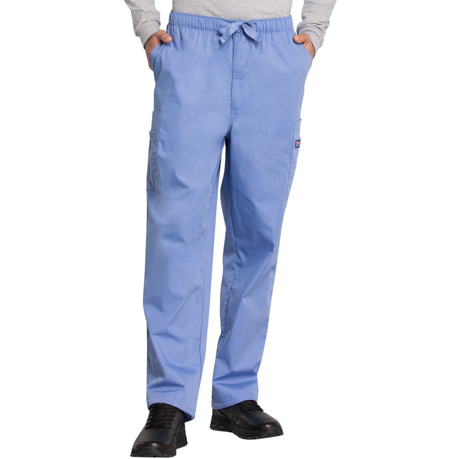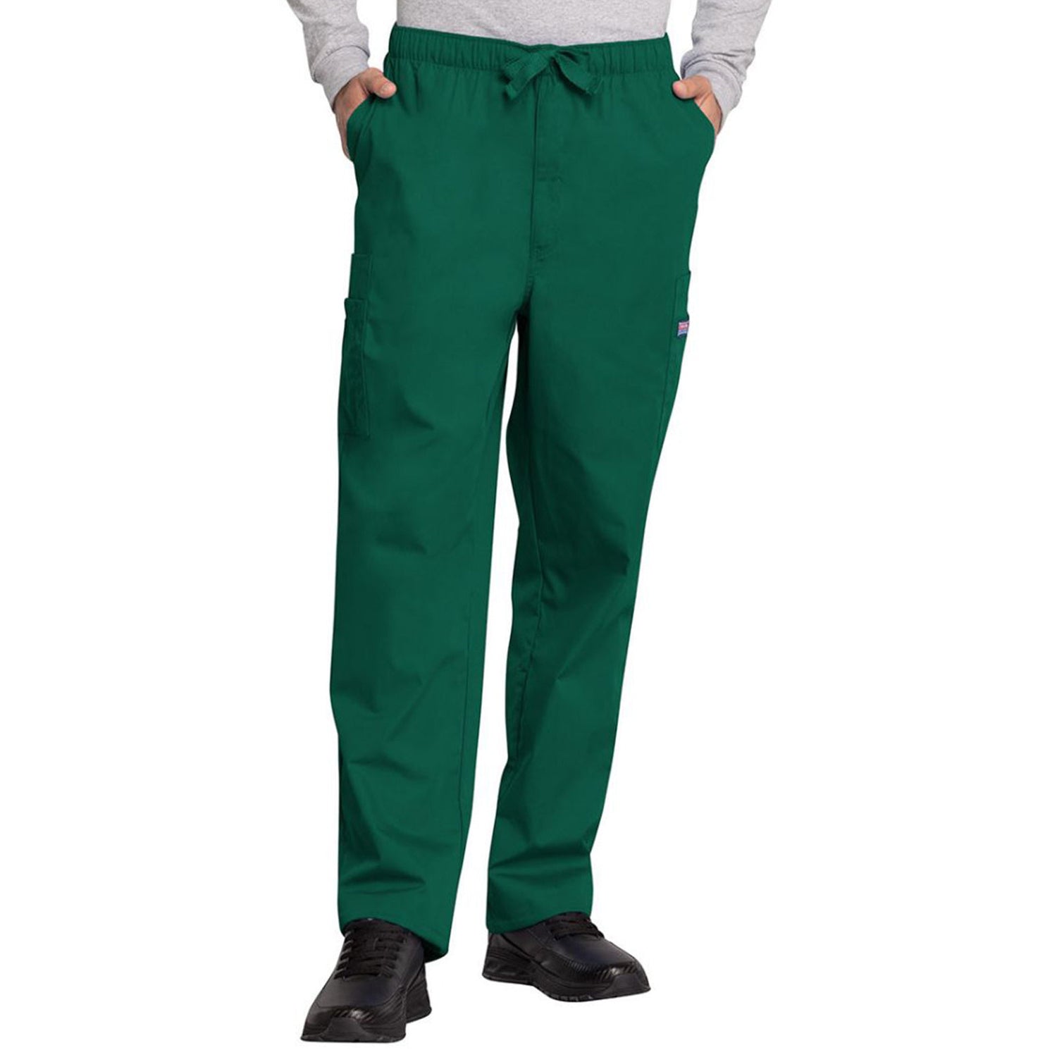 A men's traditional fit natural rise, elastic waist pant with a webbed drawstring, a functional zip fly, four side cargo pockets, front angled pockets, and a back patch pocket.