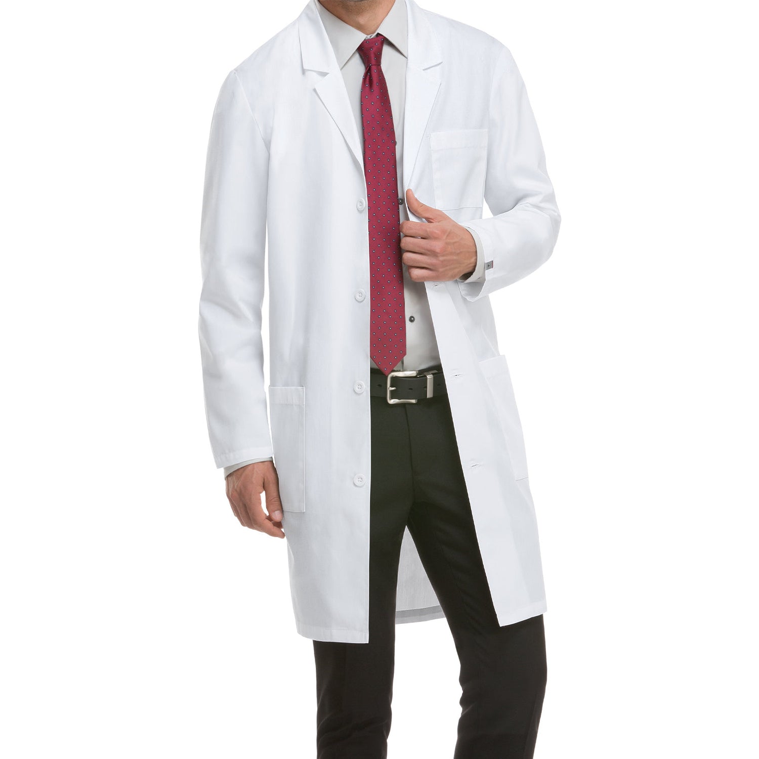 Unisex fit lab coat features a notched collar and a four front button closure. Also featured is one chest pocket, two lower patch pockets with side entry for easy access to pant pockets. A back yoke and kick pleat complete this coat. Center back length: 40".