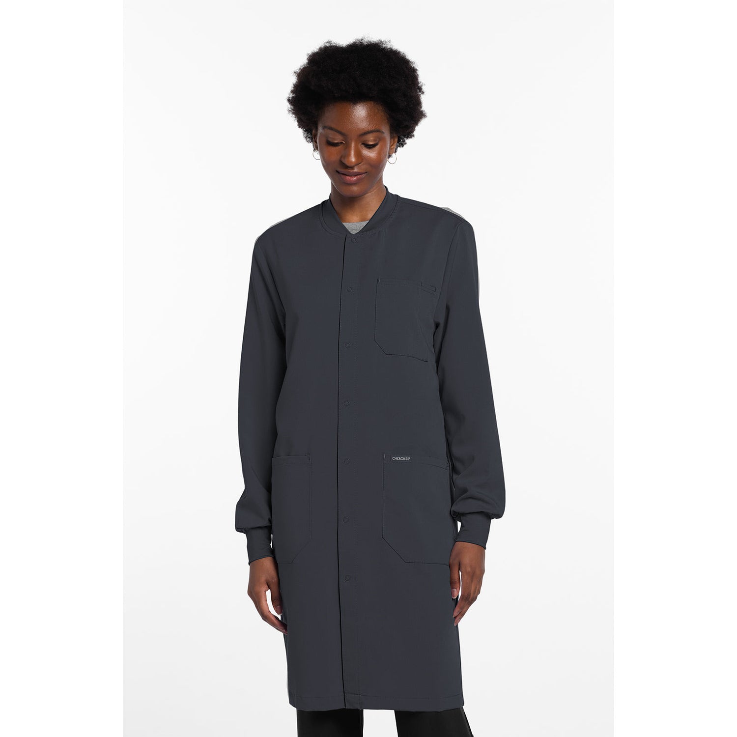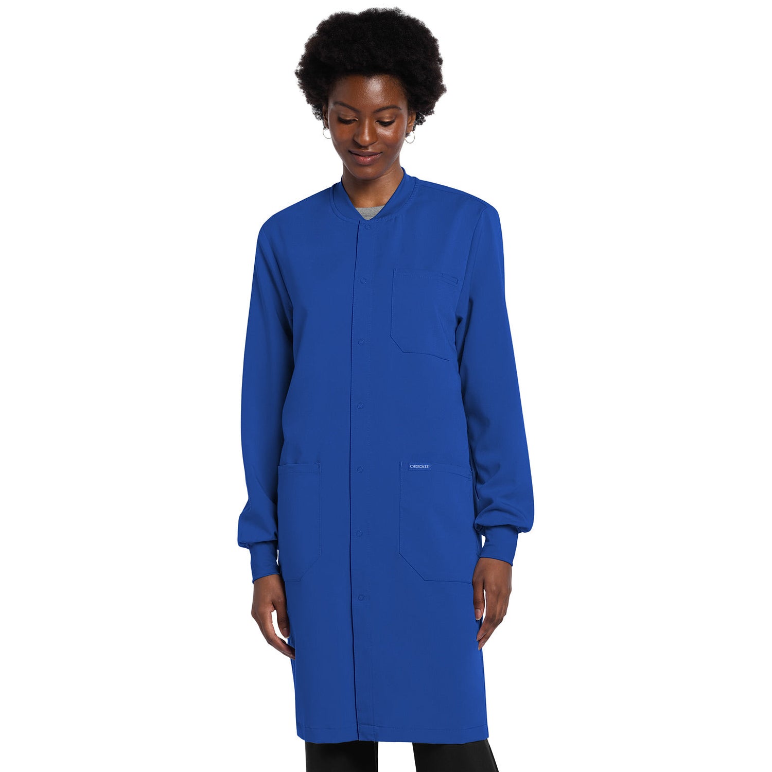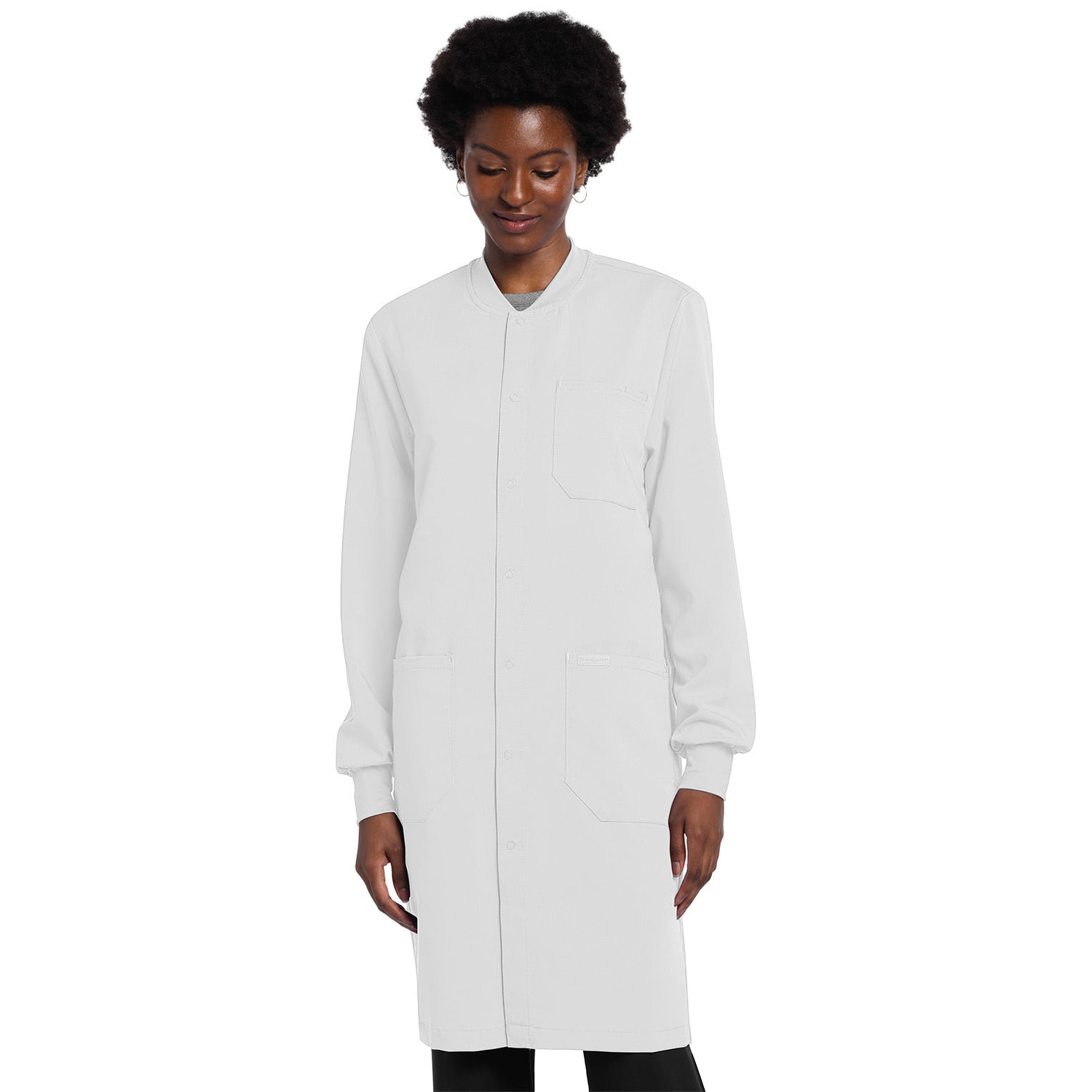 This unisex, modern fit 40" lab coat features a long length for ample coverage and a convenient snap front closure. It's part of the Project Lab collection, offering a blend of style and functionality.