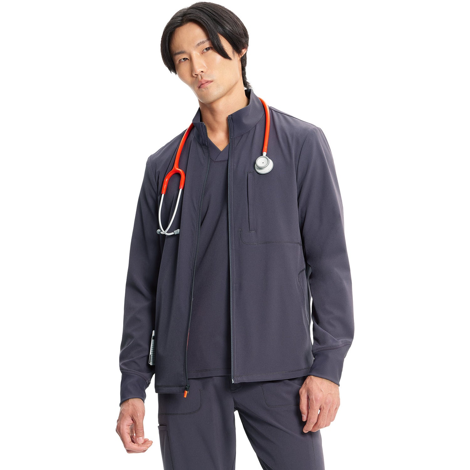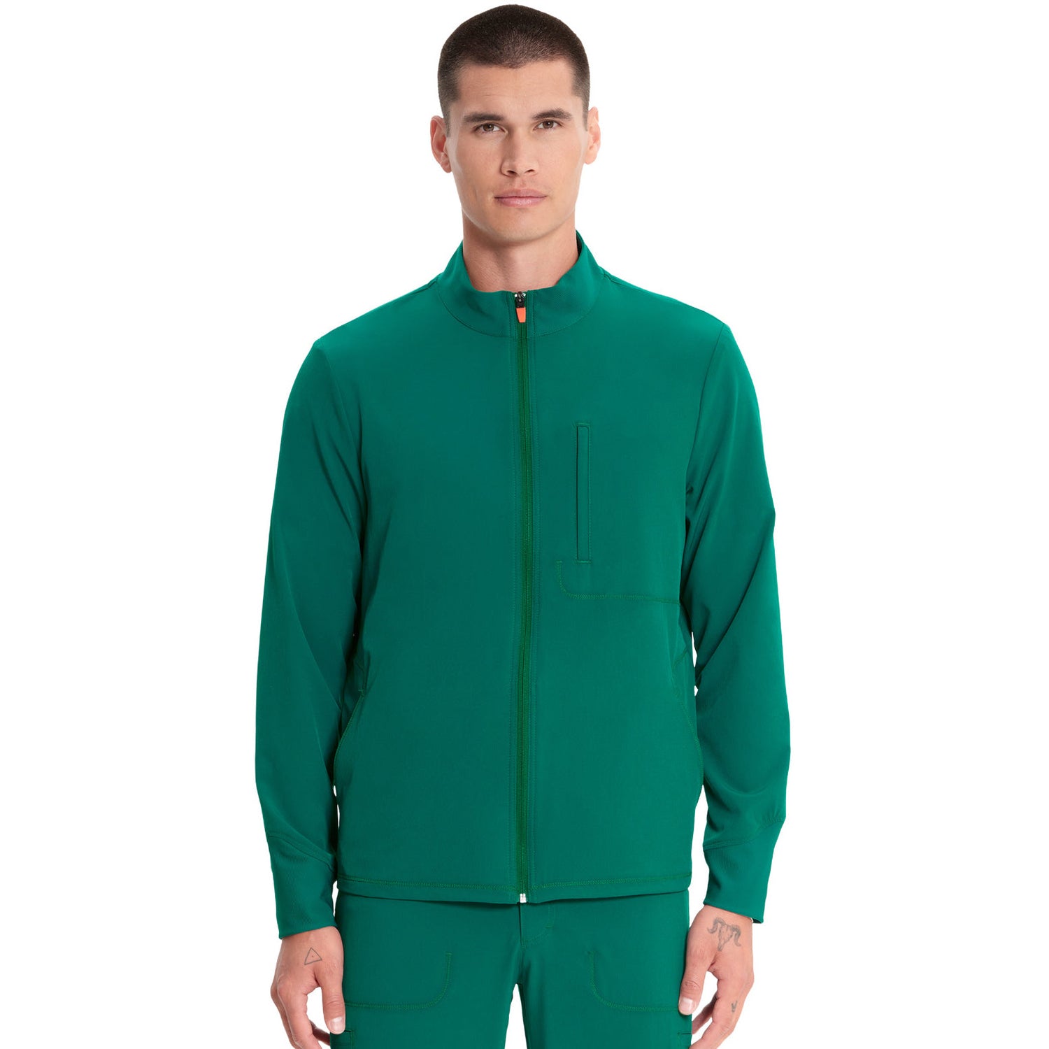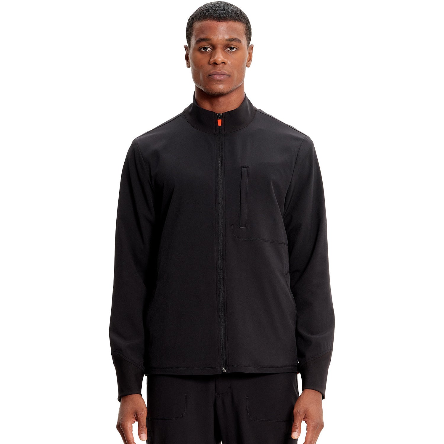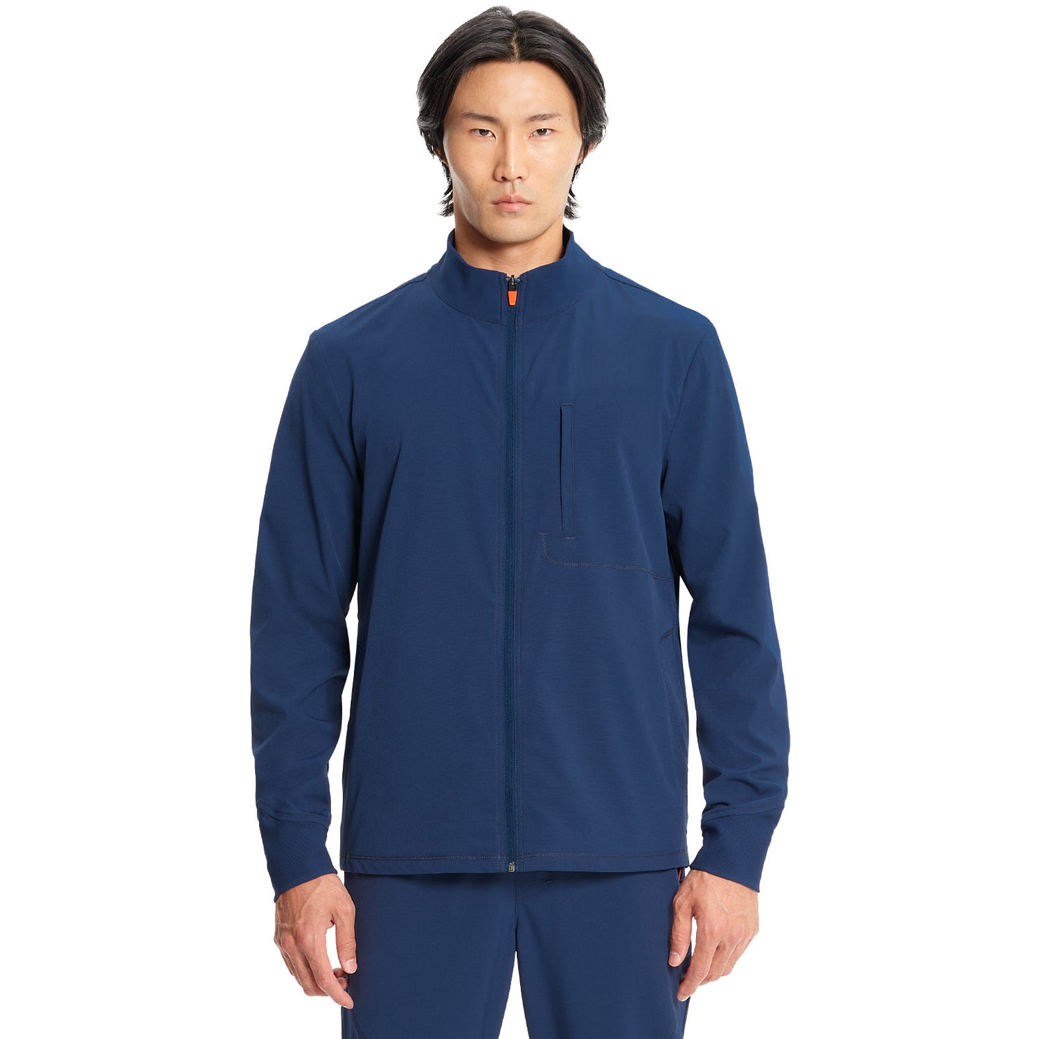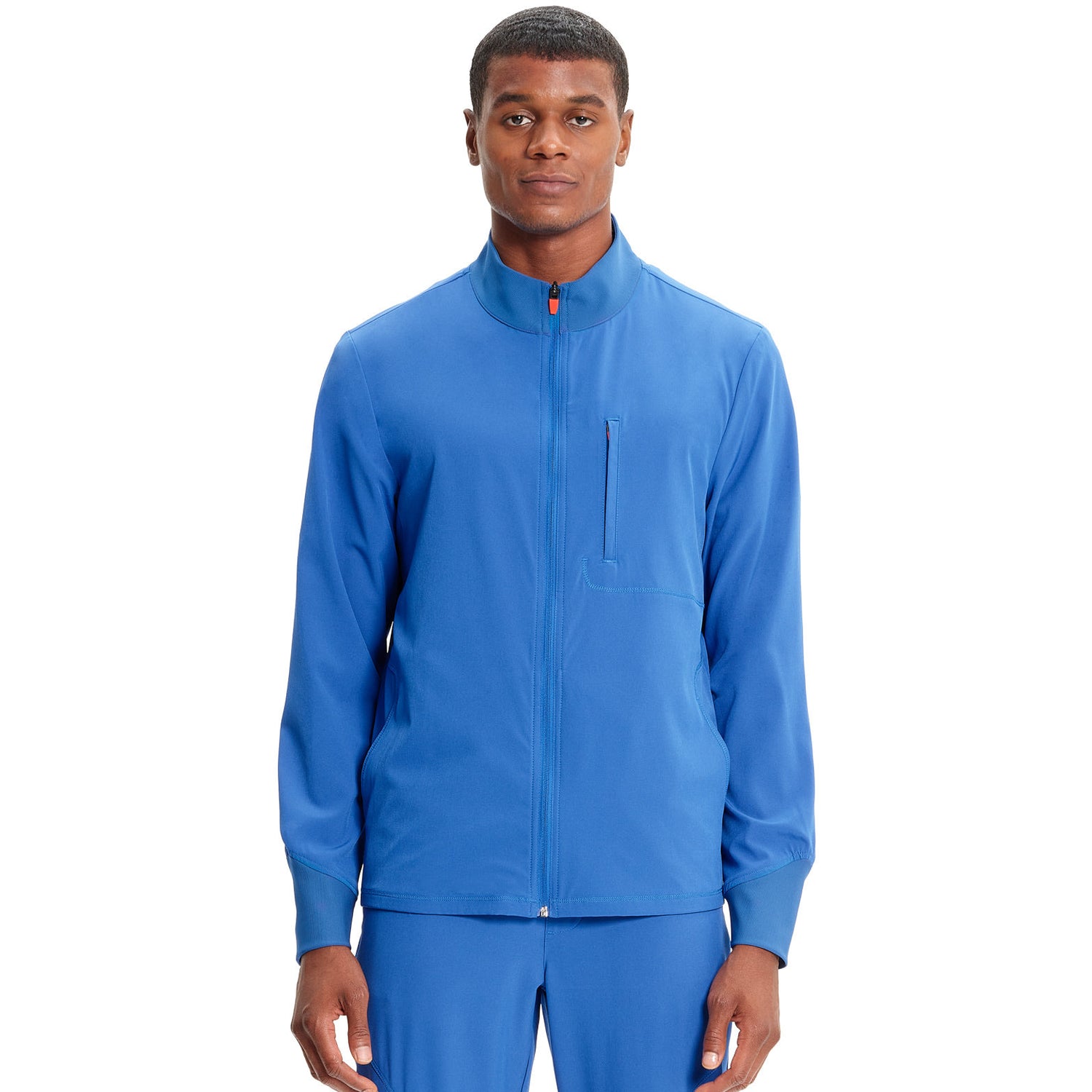 This Men's fit zip front jacket has a dyed-to-match rib-knit stand-up collar, shaped cuffs, and center back panel. There are three pockets for storage: one welt zipper chest pocket and two in-seam pockets with signature contrast mesh pocket bags. Contrast colored soft zipper pulls for easy grip. Other features include a curved back yoke for a better fit across the shoulders. Center back length: 28"