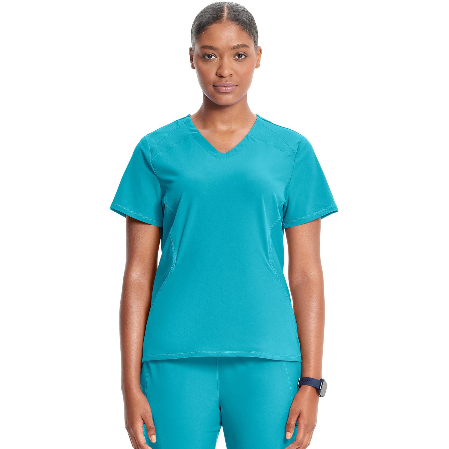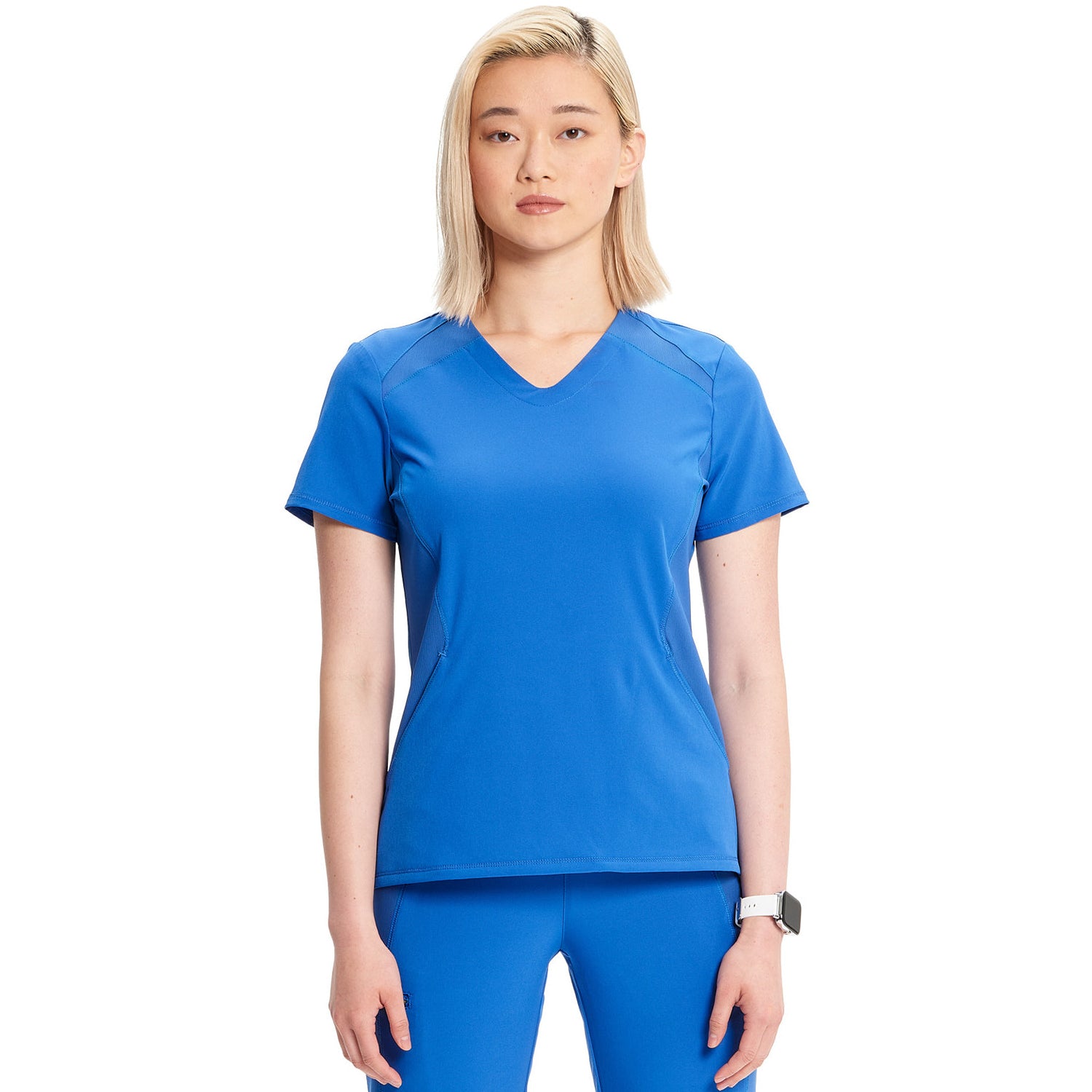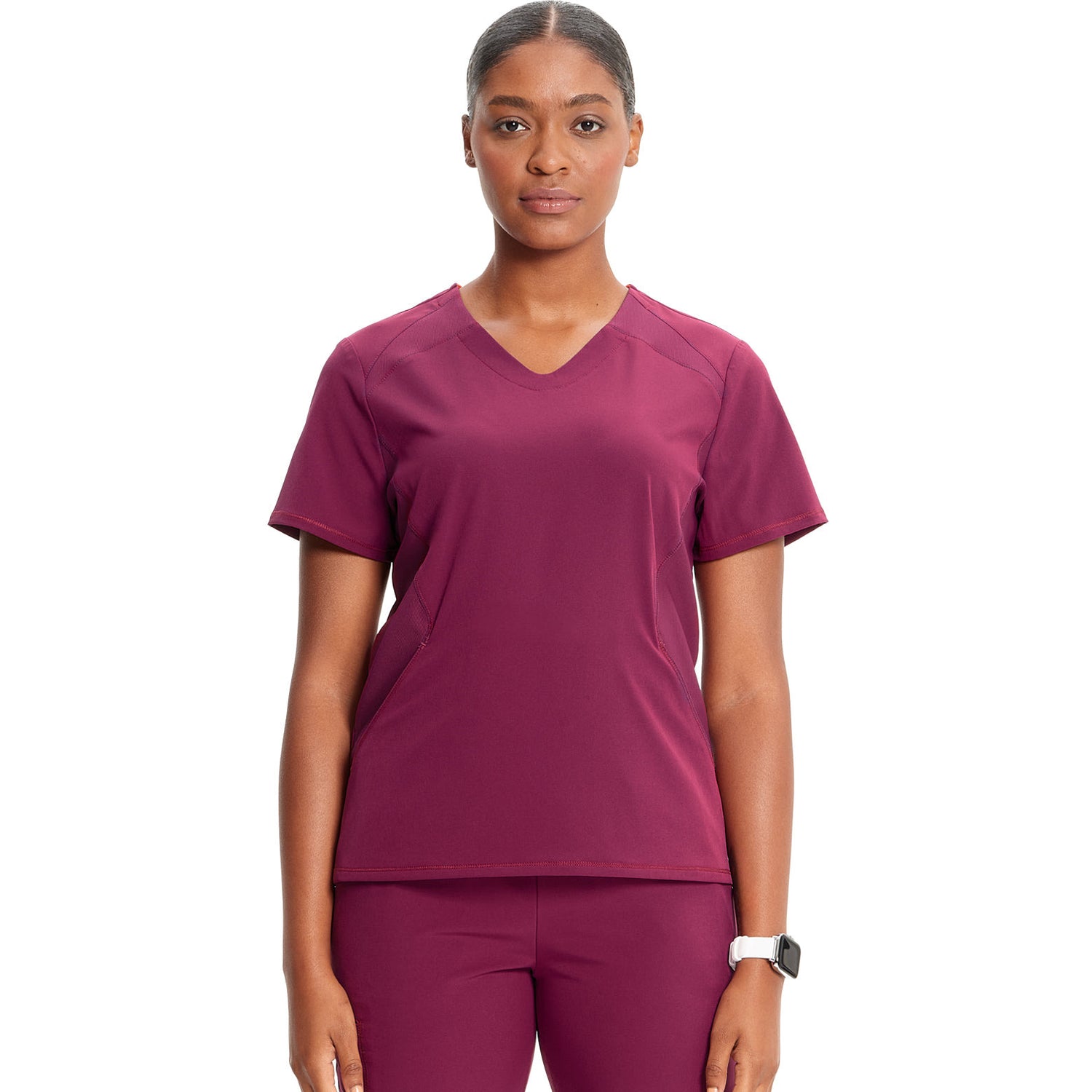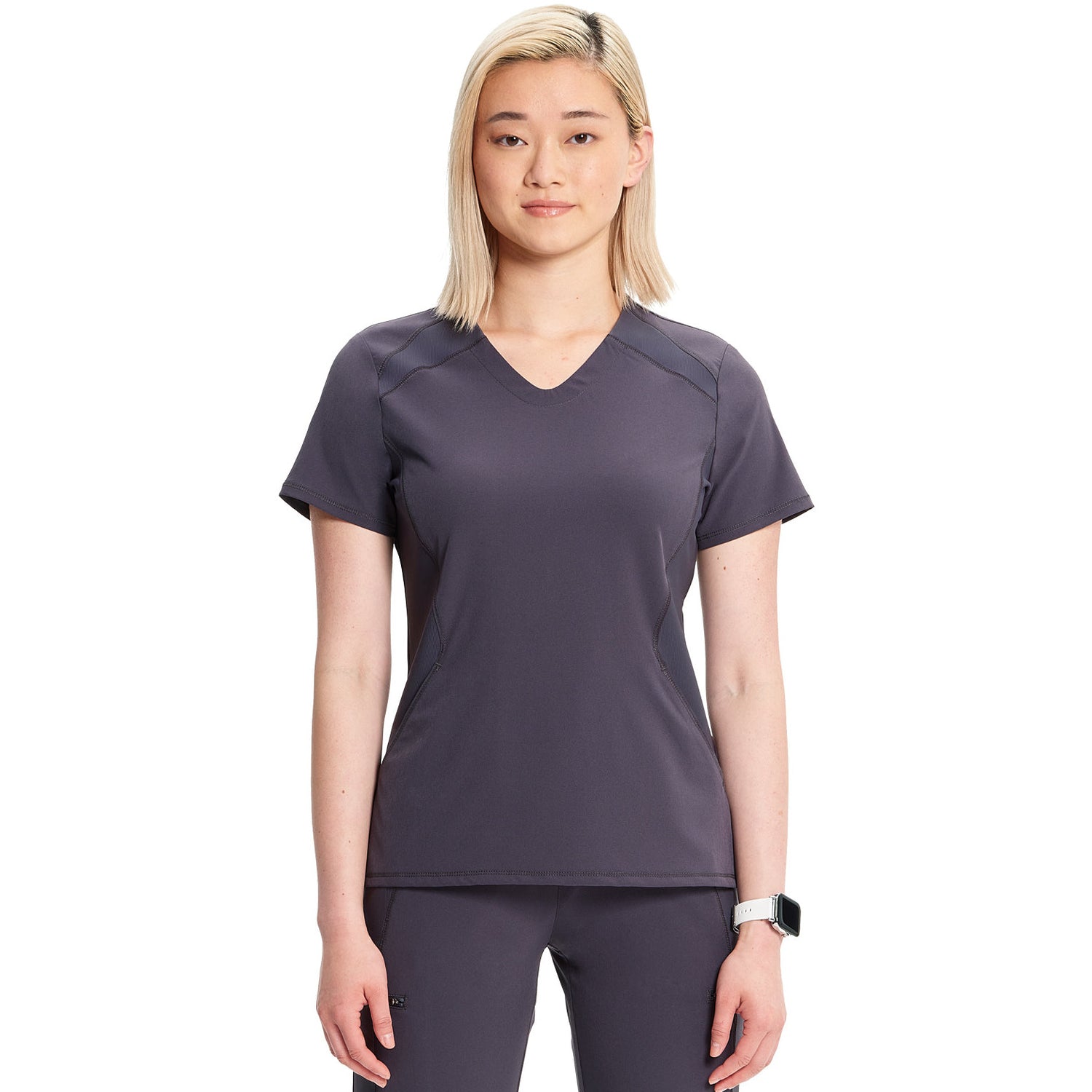 This Contemporary fit v-neck top has dyed-to-match rib-knit front yokes and sporty shaped side panels. A rib-knit back panel adds style and stretch. There is a roomy kangaroo pocket with signature contrast mesh pocket bag. Other features include a curved back yoke seam and a rounded high-low hem. Center back length: 25 ½"