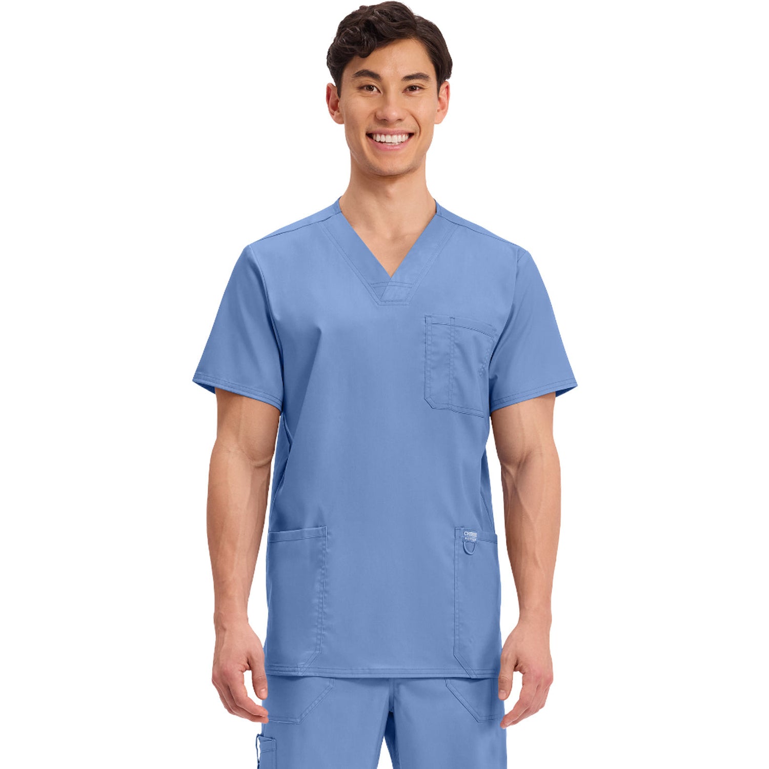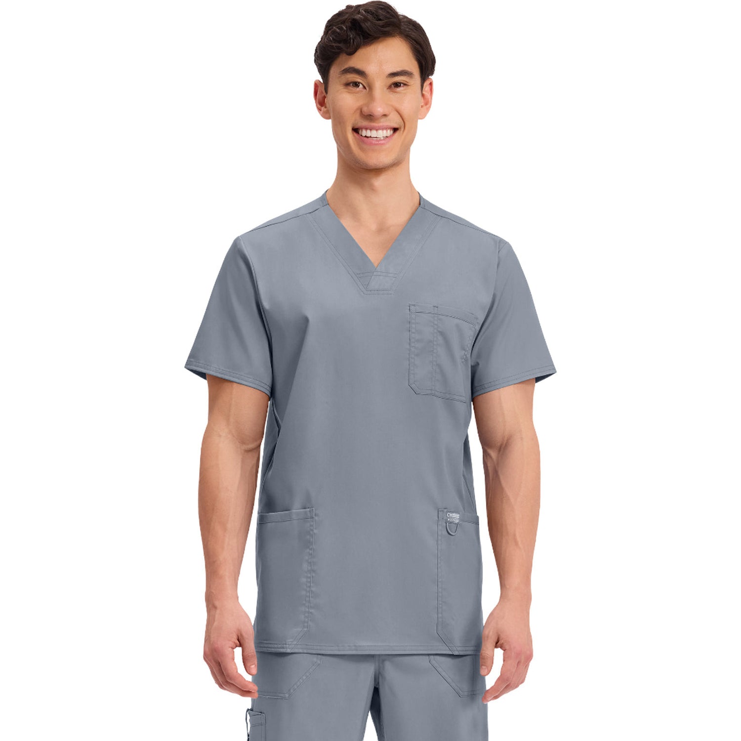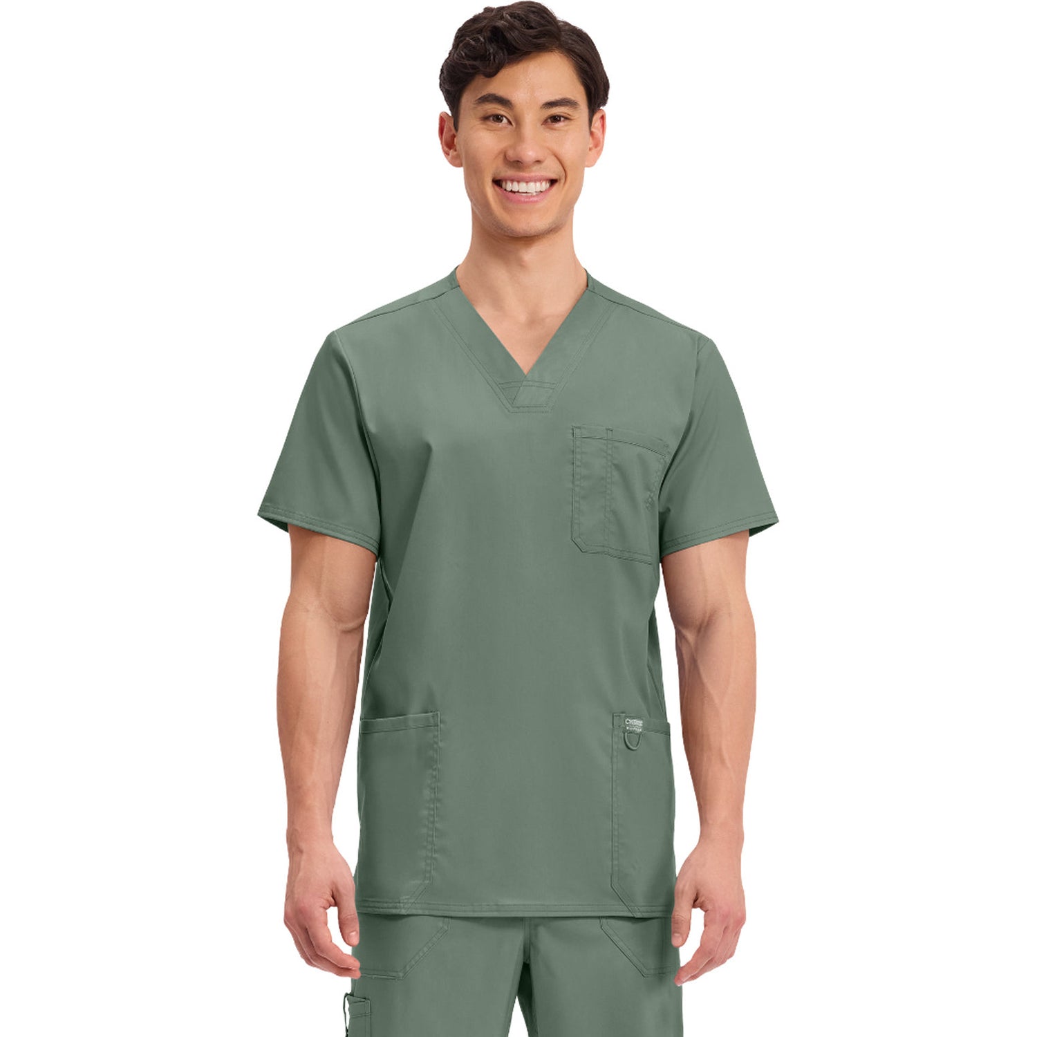 A men's modern fit v-neck top includes a chest pocket with a pencil stitch, two patch pockets, a logo label with an I.D. loop, a back yoke, and side vents.
