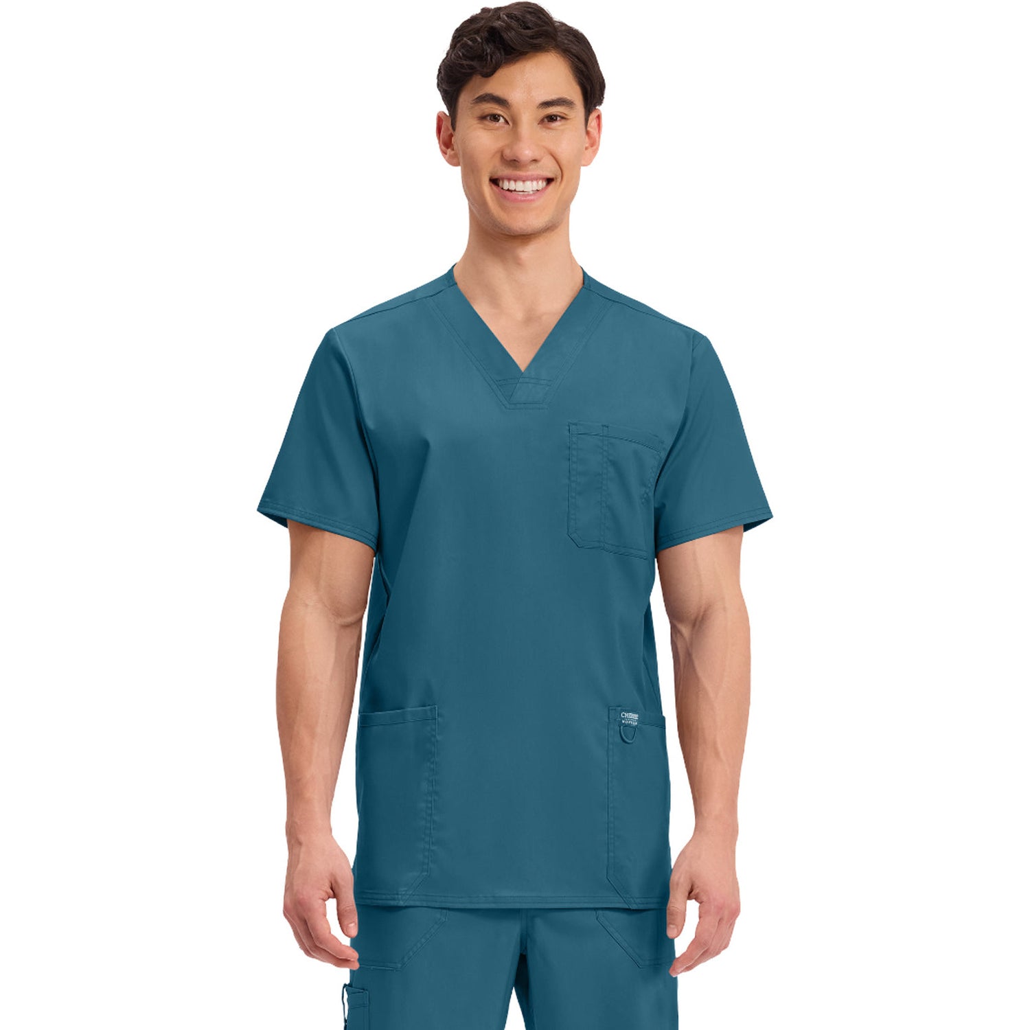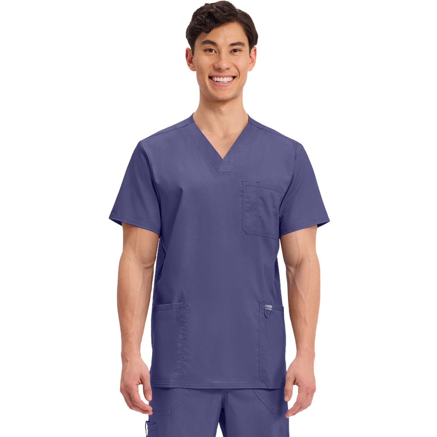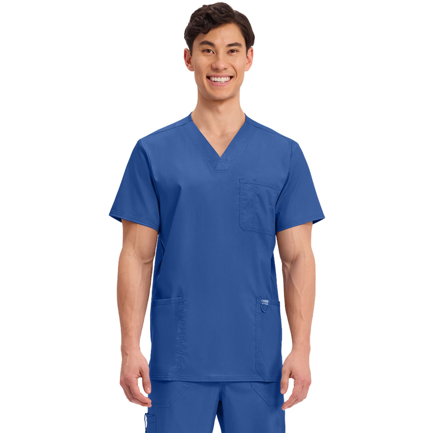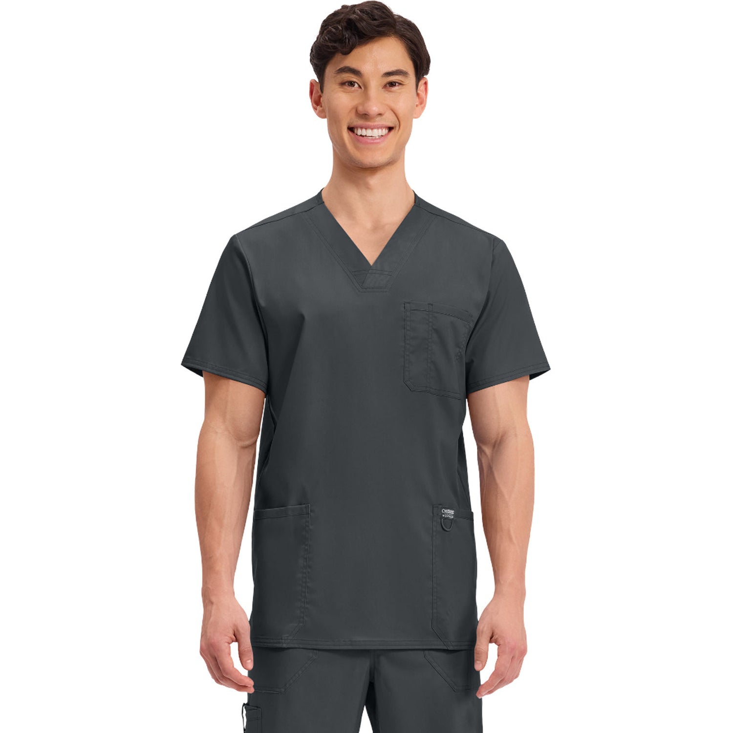 A men's modern fit v-neck top includes a chest pocket with a pencil stitch, two patch pockets, a logo label with an I.D. loop, a back yoke, and side vents.
