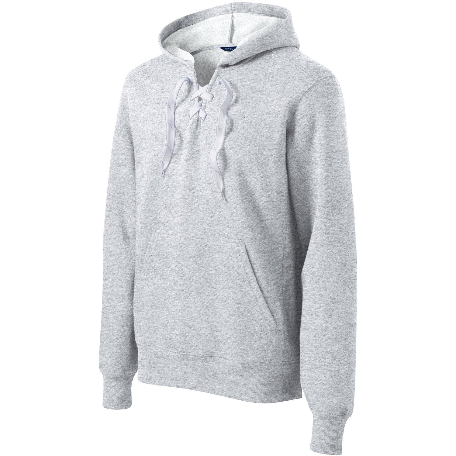 A throwback look with a lace up closure that can be personalized with school, team or group colored laces. (Additional laces sold separately.) | 9-ounce, 65/35 ring spun combed cotton/poly fleece White lace drawcord with grey tick stitching Twill-taped neck 2x2 rib knit side gussets, cuffs and hem with spandex Front pouch pocket * Please note: This product is transitioning from woven labels to tag-free labels. Your order may contain a combination of both labels