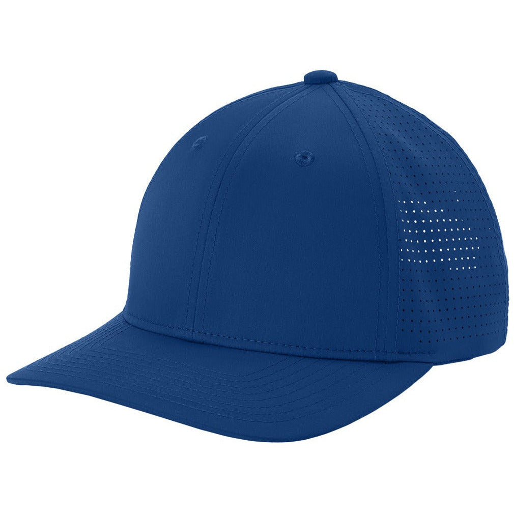 96/4 polyester/spandex Moisture-wicking Stretch-Tek sweatband technology for a comfortable fit Moisture-wicking fabric Laser cut ventilation in mid and back panels for breathability Curved bill with Pro-Cut sticker Iron Grey undervisor Sport-Tek branded taping Structured Mid-profile 7-position adjustable snapback closure