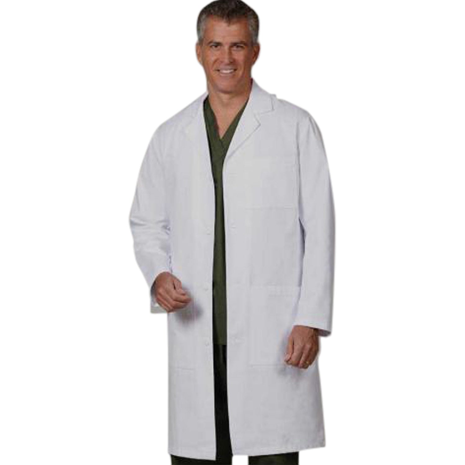 This unisex 41" lab coat features a plastic button closure, 1 chest pocket, 2 lower pockets, and oversized pockets.