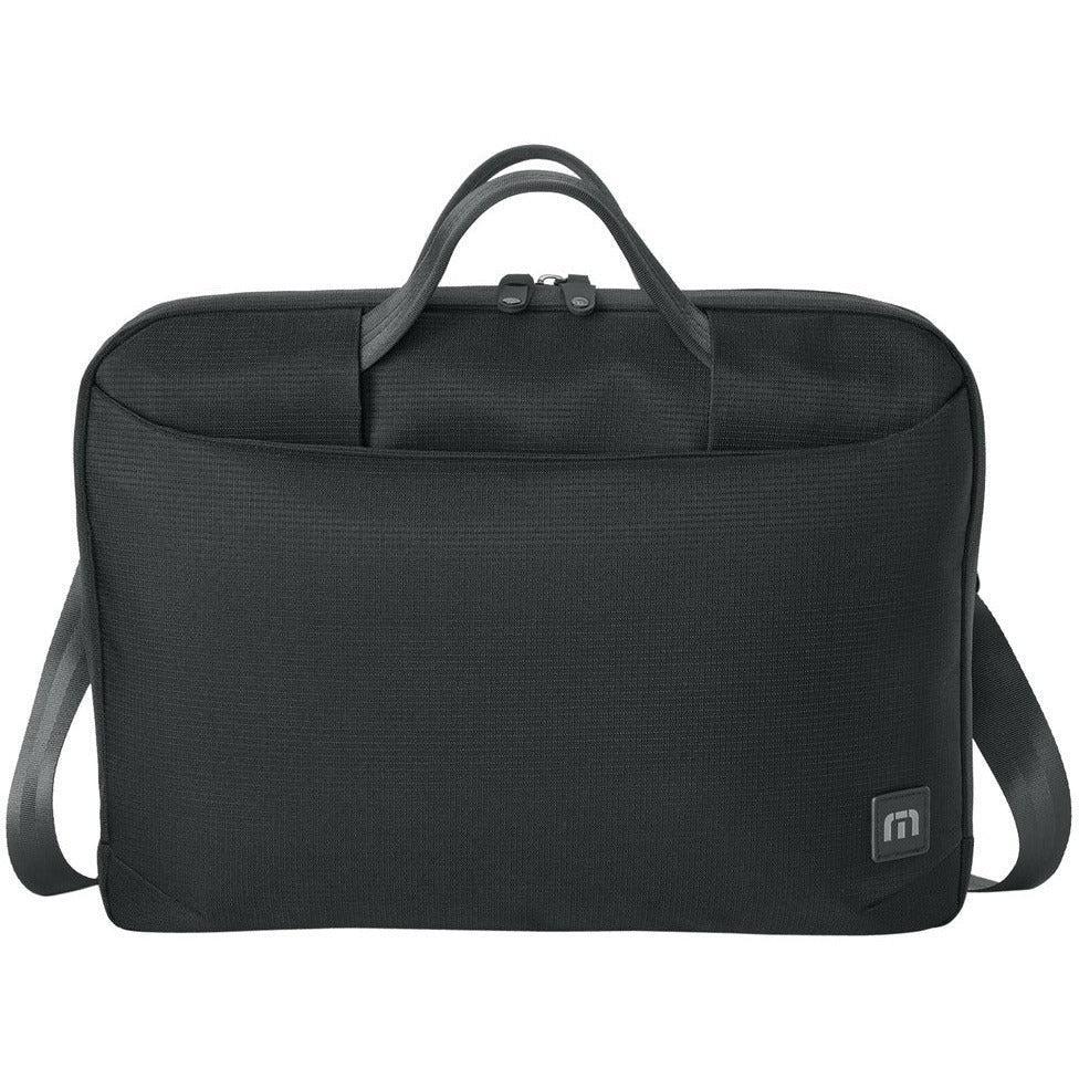 A cross between a slim brief and a messenger, this multifunctional wonder has plenty of room for your laptop and work essentials. 100% poly mini ripstop Durable water repellent (DWR) finish Front slip pocket with hidden zipper to access interior organization Retractable handles tuck away for easy storage Detachable, adjustable, padded shoulder strap Integrated zippered luggage trolley pass through Rubberized TM logo patch Laptop sleeve dimensions: 11'h x 15'w x 1'd; fits most 17' laptops Dimensions: 12.25'h x 16.5'w x 4'd Capacity: 671.25 cu. in./11 L Weight: 1.87 lbs./0.85 kg Note: Bags not intended for use by children 12 and under.