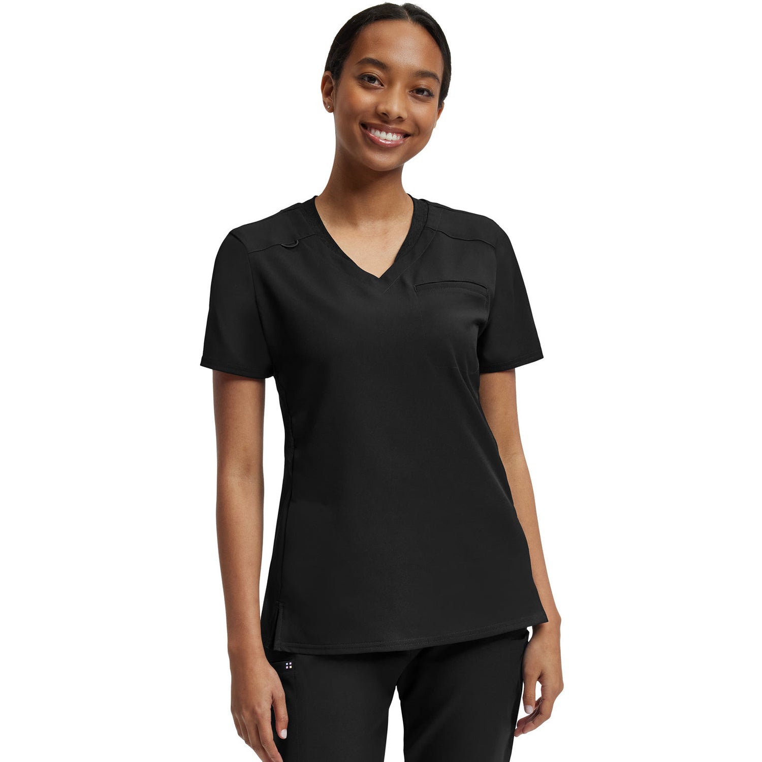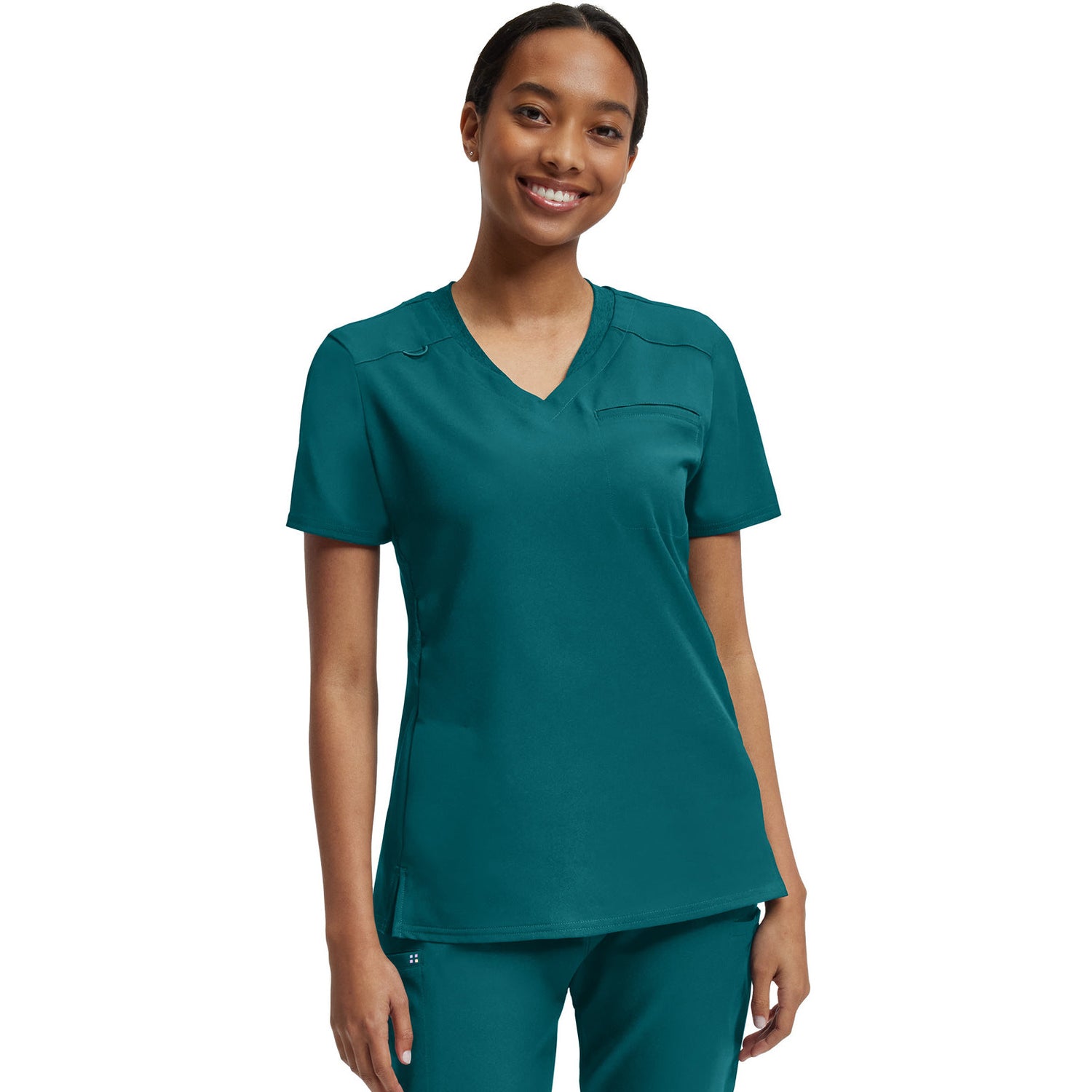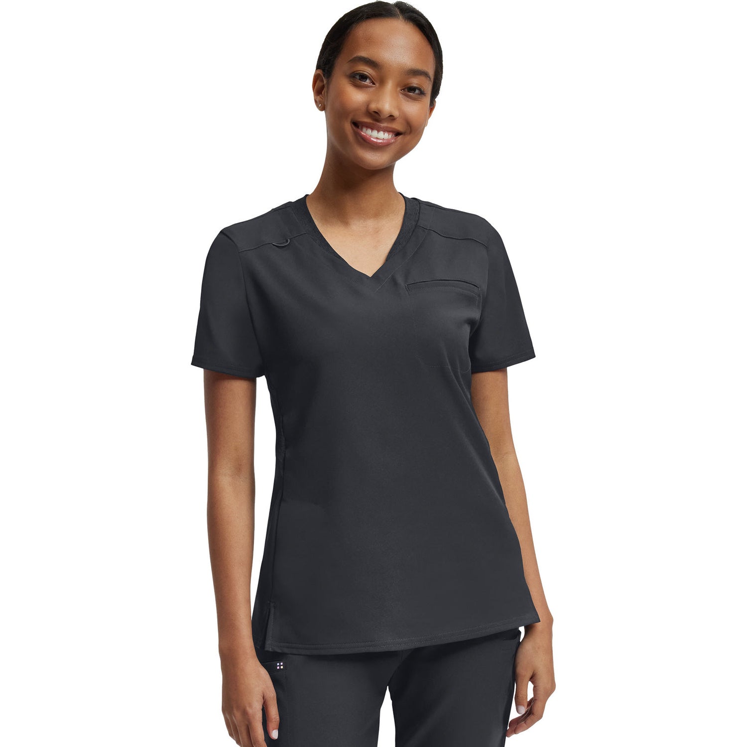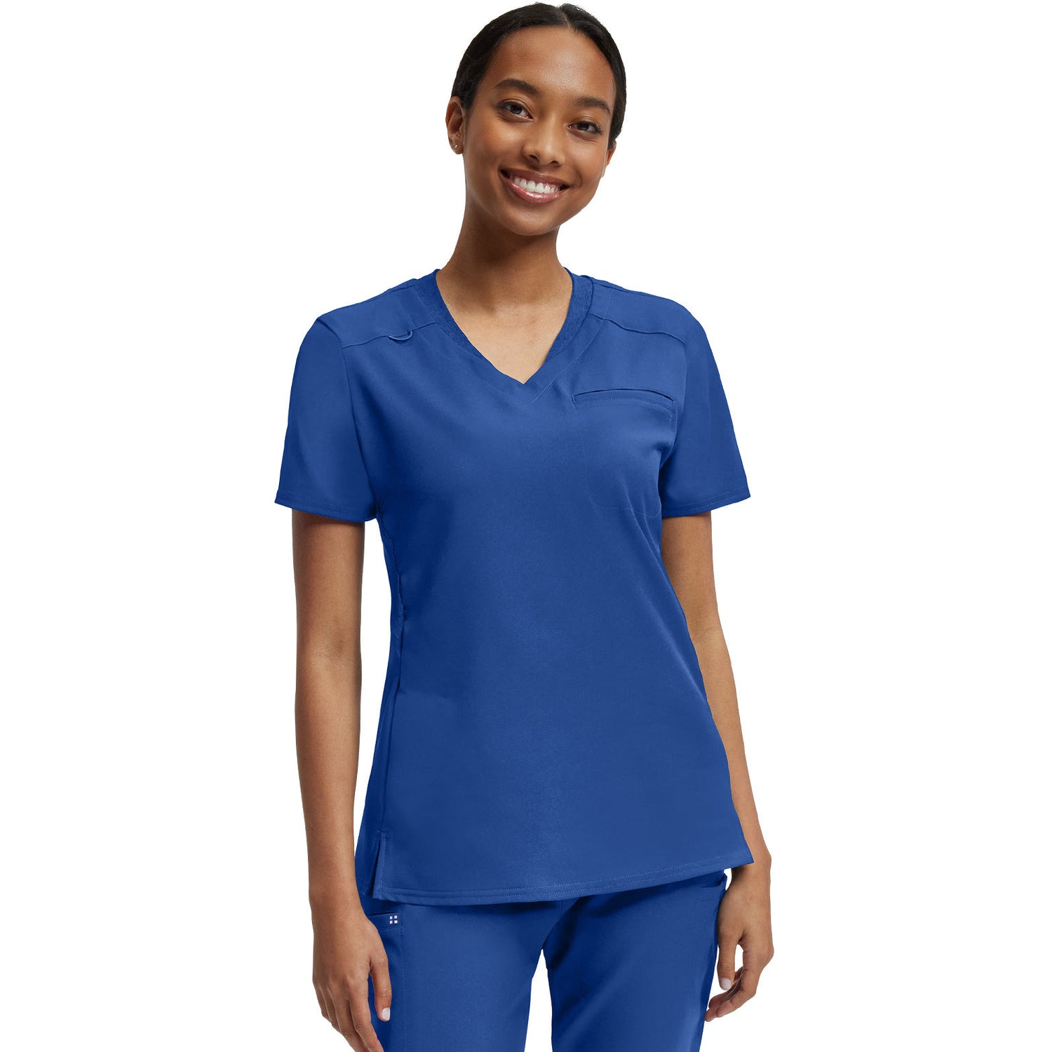 This V-neck top for women embodies a contemporary and adaptable style, featuring a knit collar and side panels that offer breathablity and freedom of movement. With a chest pocket and a side pocket, this top provides a practical tuck-in option for added convenience.