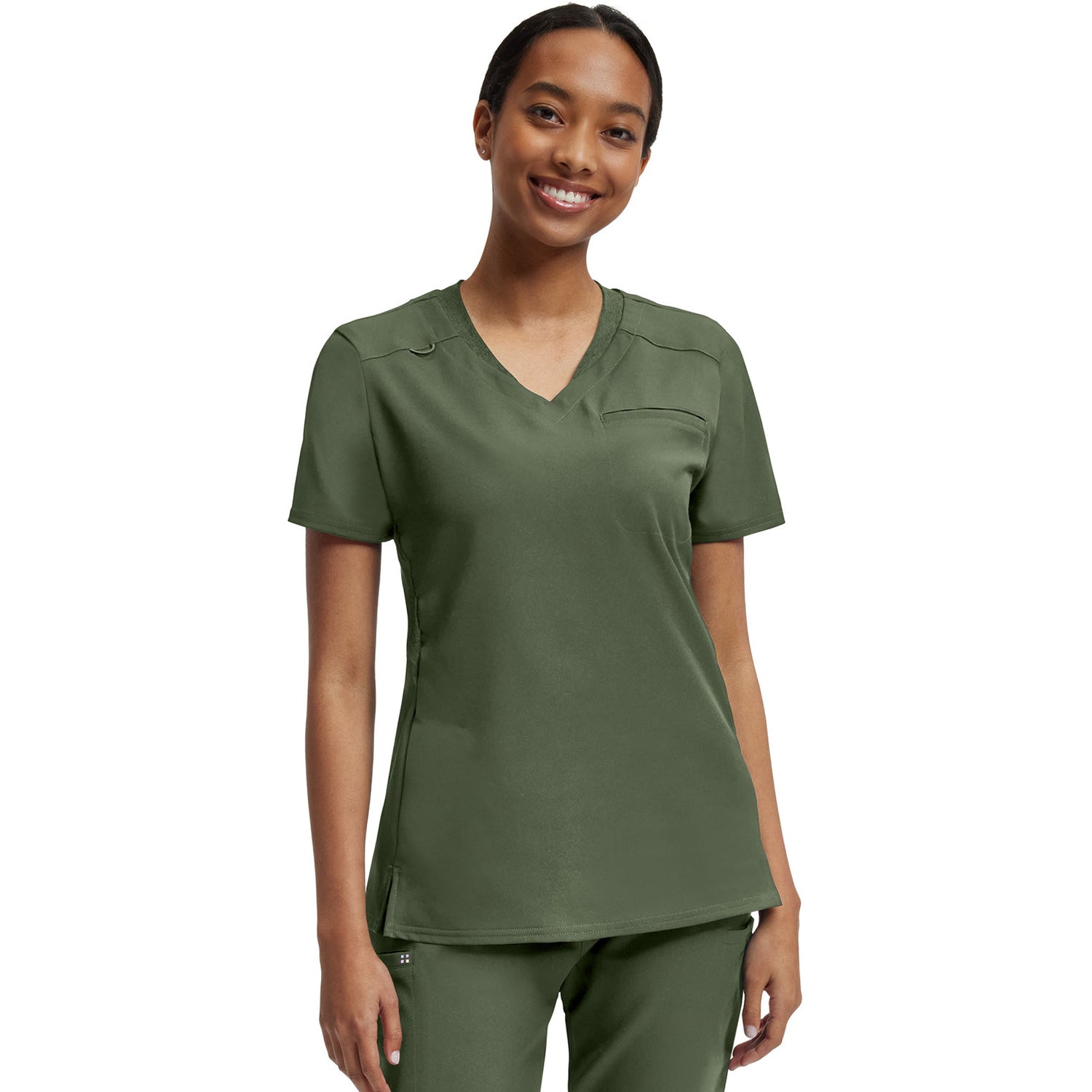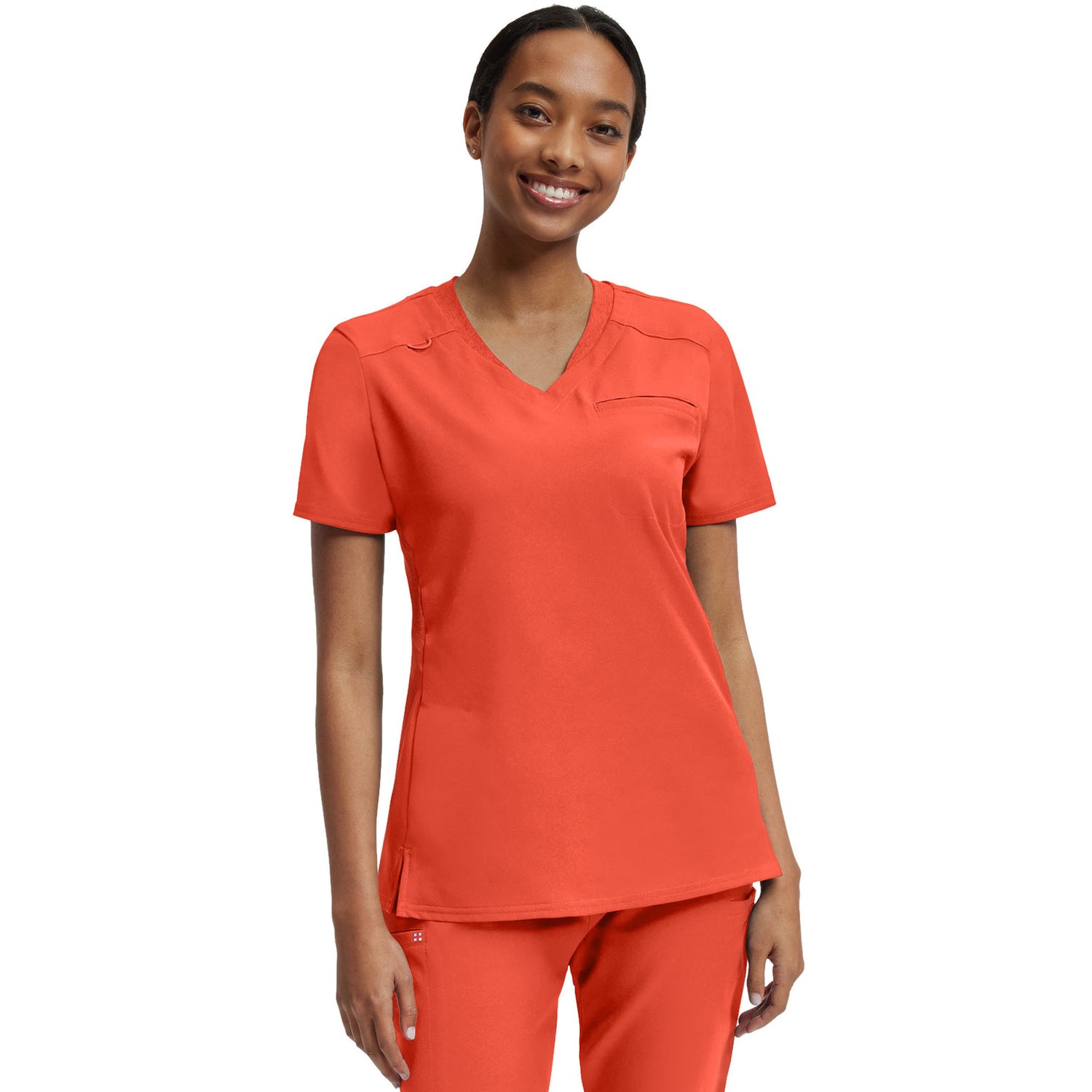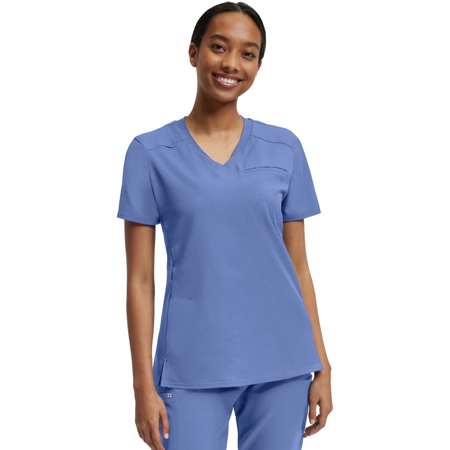 This V-neck top for women embodies a contemporary and adaptable style, featuring a knit collar and side panels that offer breathablity and freedom of movement. With a chest pocket and a side pocket, this top provides a practical tuck-in option for added convenience.