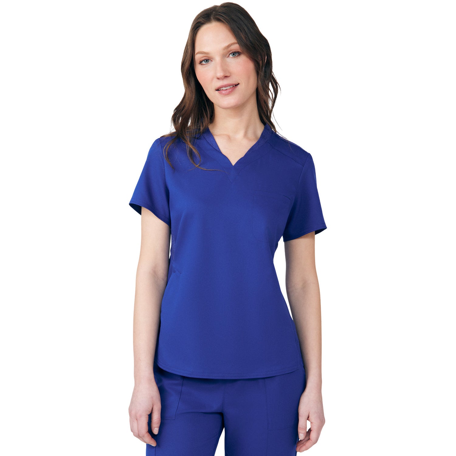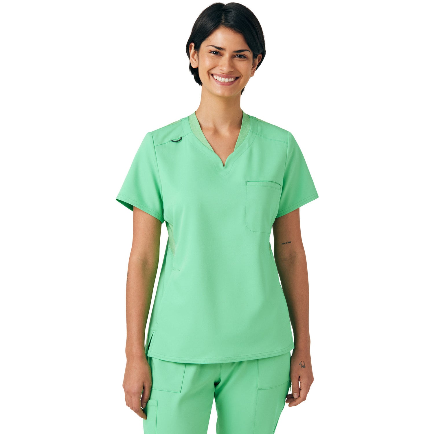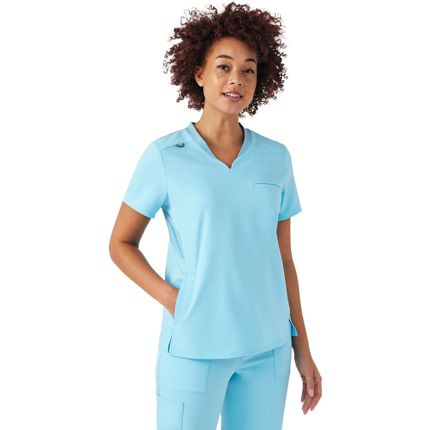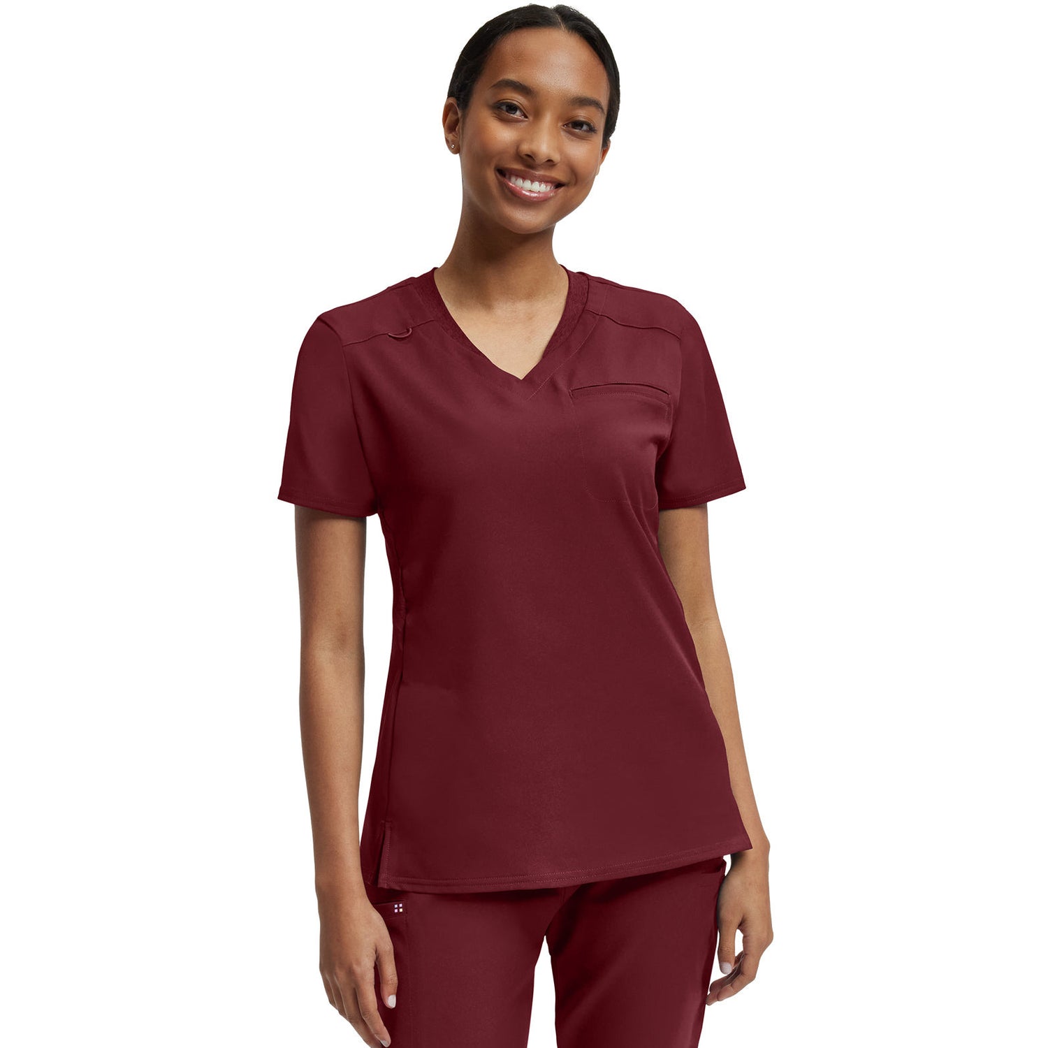 This V-neck top for women embodies a contemporary and adaptable style, featuring a knit collar and side panels that offer breathablity and freedom of movement. With a chest pocket and a side pocket, this top provides a practical tuck-in option for added convenience.