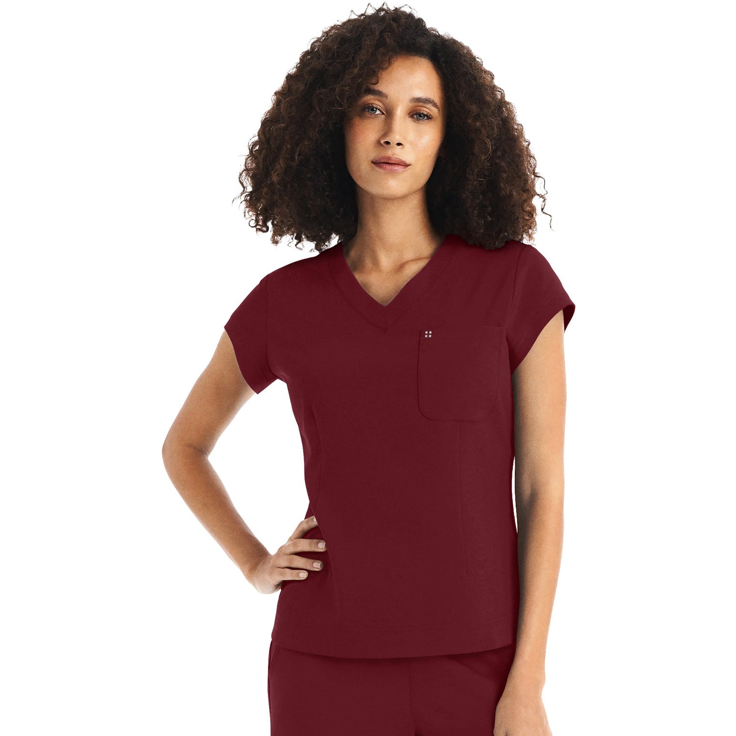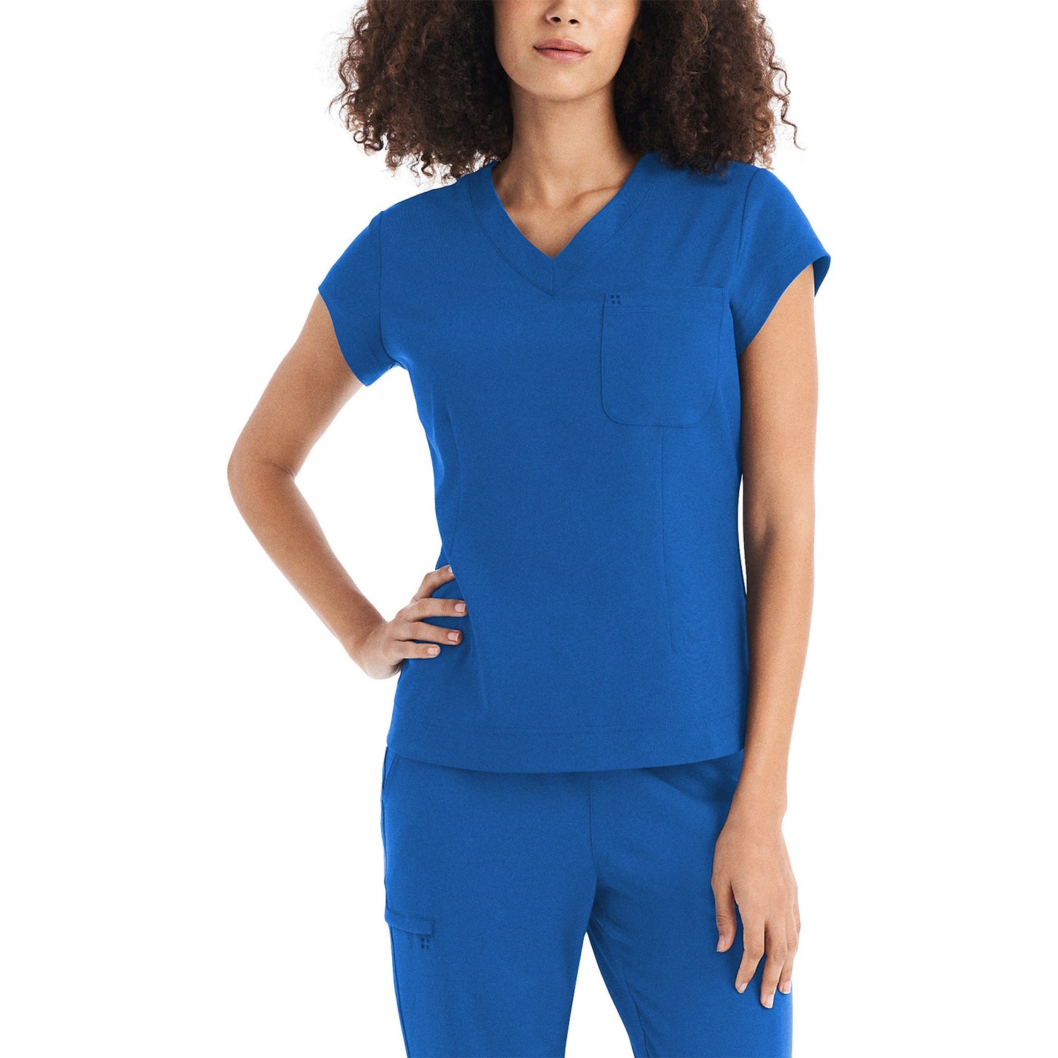 This Modern Fit v-neck top offers a tailored fit with front princess darts and back princess seams. Features a single chest pocket and shirttail hem for an easy tuck-in option. Cap sleeves and back side knit panels offer easy movement and added comfort. Center back length: 26".