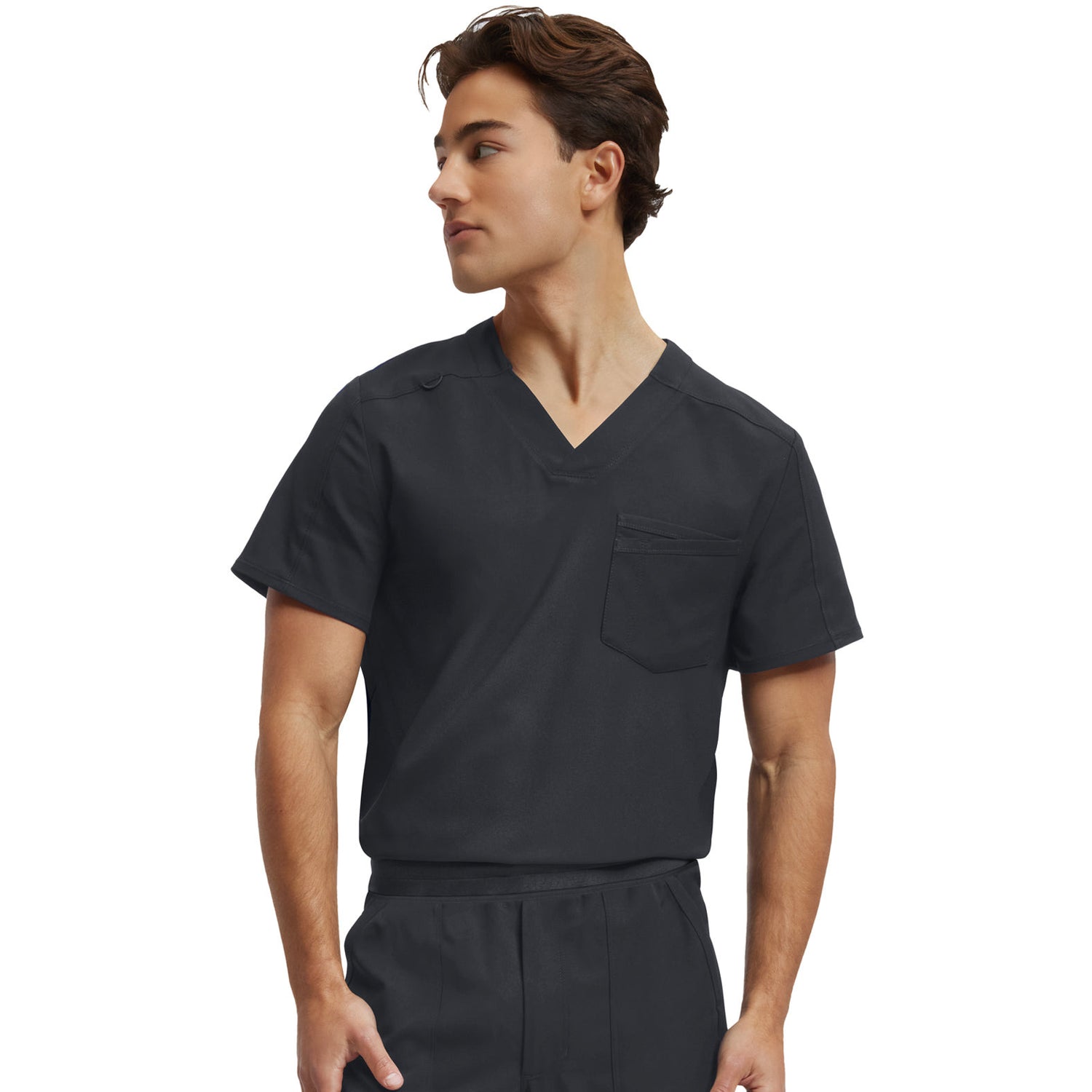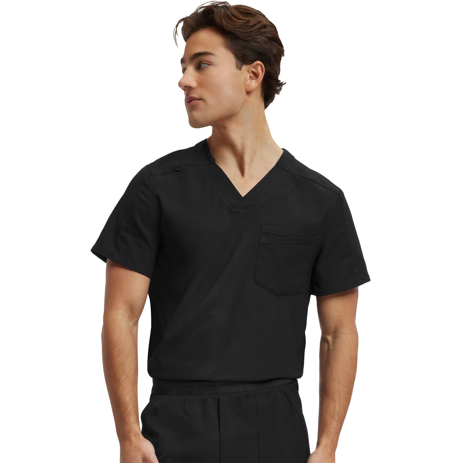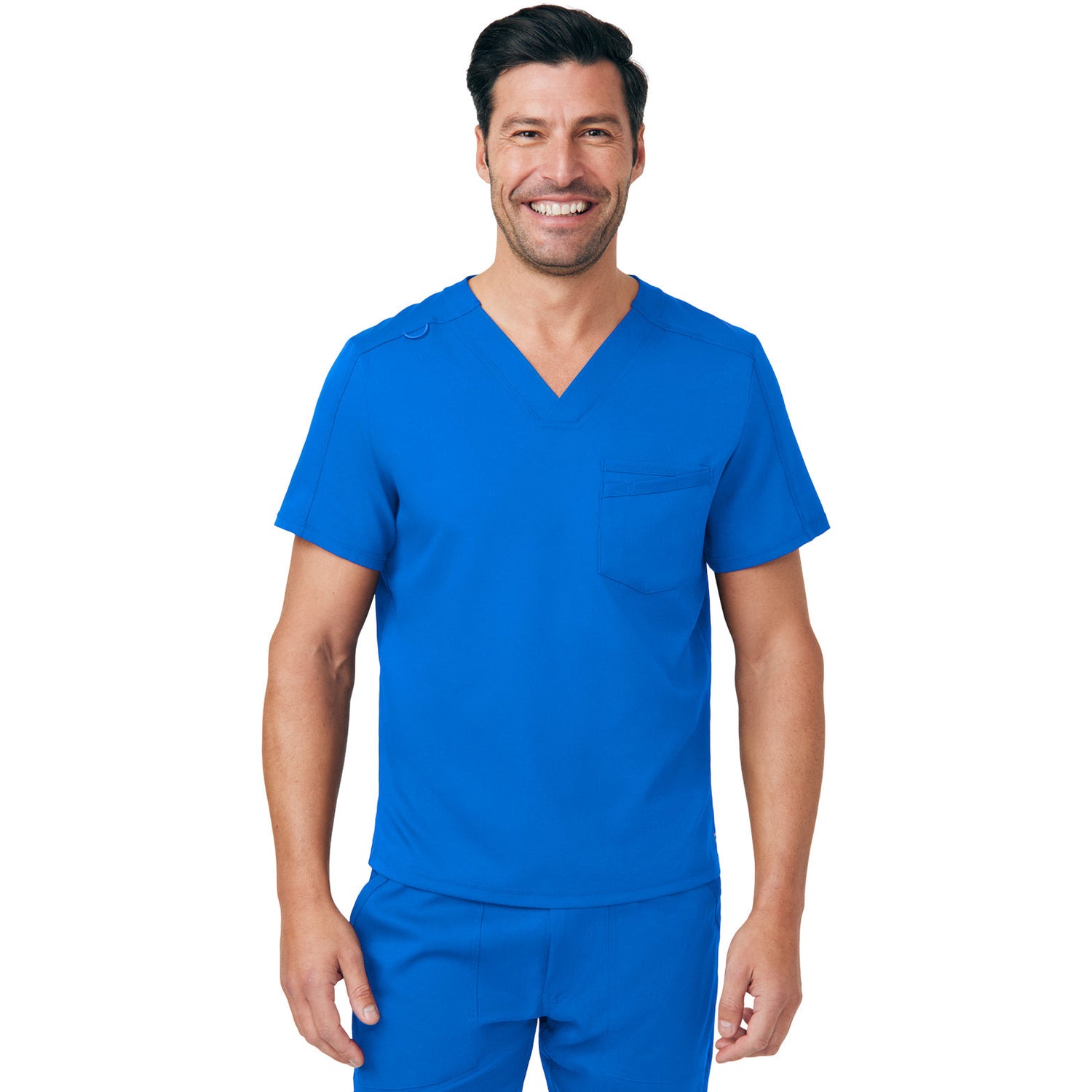 The men's scrub top showcases a sporty yet polished design, seamlessly blending the timeless V-neckline with a tuck-in style for a sharp and stylish appearance. Additionally, this design incorporates a double chest pocket with a dedicated pen slot for added functionality.