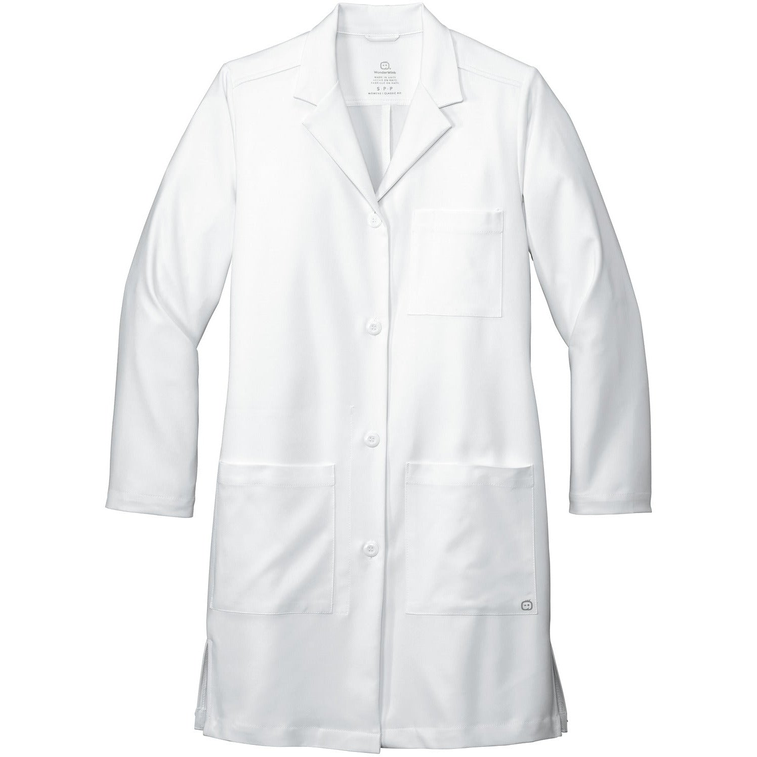 65/35 poly/cotton poplin Locker loop Left chest pocket with pen slot Top-loading front pockets Interior tablet pocket Side seam opening for easy access to pants pockets Back yoke 4-button placket opening Center back vent Wink heat transfer logo at left pocket Size medium: 38-inch back length